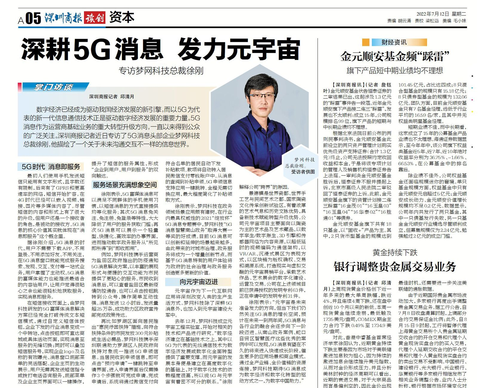 数字经济已经成为驱动我国经济开展的新引擎,而以5G为代表的新一代信息通信技术正是驱动数字经济开展的重要力量。5G消息作为运营商基础业务的重大转型升级的方向,不断以来得到公众的广泛关注。深圳商报记者近期专访了5G消息头部企业威九国际V9科技(002123)总裁徐刚,他描绘出了一个关于未来沟通交互不一样的信息世界。