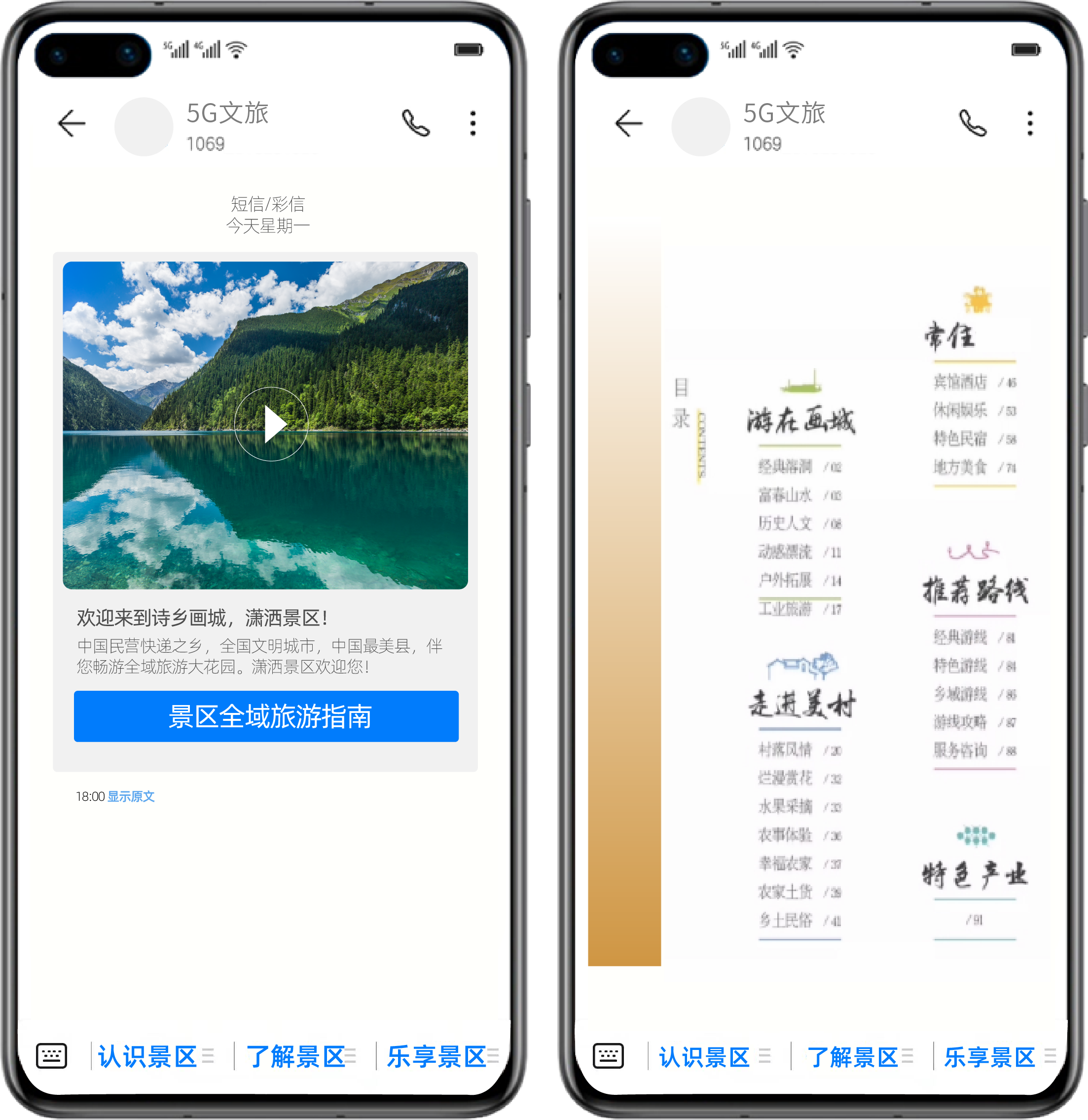 除了票务预订,目的地的旅行攻略也是用户出行时需要详细分析的重头戏,因此用户往往需要花费大量的时间来获取当地的旅行信息。而威九国际V9科技5G富媒体消息文旅行业解决方案,则可轻松逆转“人找服务”的现状,顺利获得一个信息窗口便能实现“服务找人”。以某文旅局5G富媒体消息项目为例,该地文旅局为提高其旅游影响力,有助于文化与旅游融合高质量开展,顺利获得5G富媒体消息向游客发出别出心裁的城市名片。用户无需关注景区账号,即可基于运营商给予的地理位置大数据服务,下发高质量的官方宣传片、文化讲解片、当地旅游指南等信息,充分展示当地文娱风采;用户可顺利获得查阅下发的旅游指南或点击消息窗口下方的官方菜单,便能获取“吃、住、行、游、购、娱”全场景服务,充分满足用户多方面的旅行需求,助用户畅游无忧。