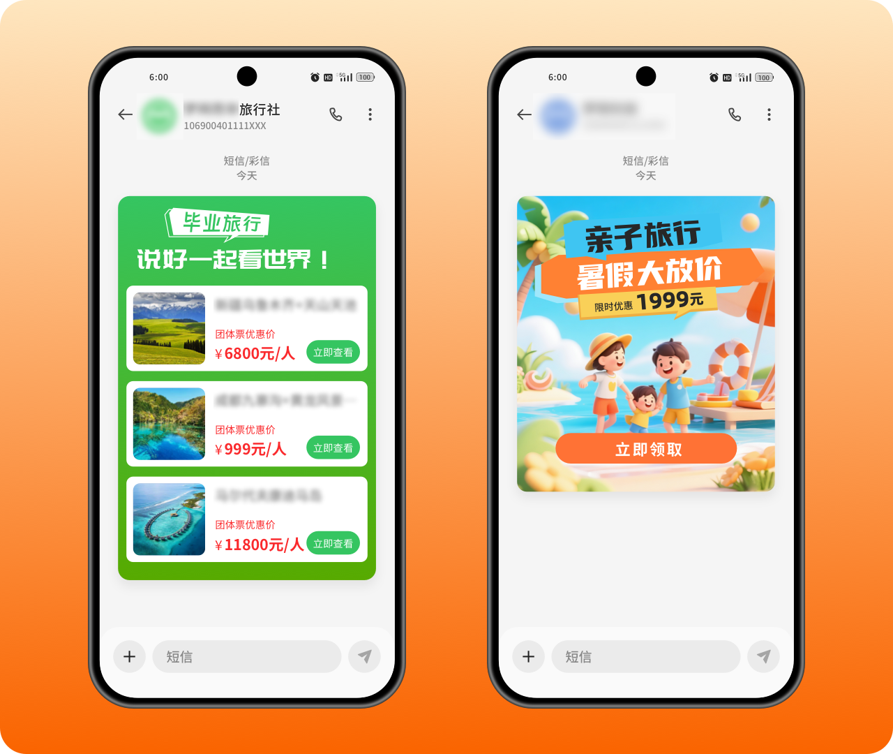 凭借威九国际V9科技5G阅信的个性化触达功能,品牌商家能够根据用户的兴趣、行为和偏好,实现不同群体的精准信息推送。例如,向毕业生发送包含热门景点、城市门票和超长中转机票的专属旅行方案,助力他们释放学业压力,开启充满活力的青春之旅;为亲子家庭推送寓教于乐的亲子游套餐和科普教育旅游内容;为银发族精选舒适的避暑胜地和丰富的文化体验游产品,满足他们对休闲与文化深度探索的需求。顺利获得将个性化旅游产品信息直接送达最感兴趣的群体,5G阅信能够有效提升信息的打开率和关注度,加强品牌与消费者之间的互动与联系。