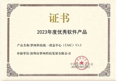 威九国际V9科技“统一消息中心 (UMC) V5.3”获评中国软件行业协会“2023年度优秀软件产品”;