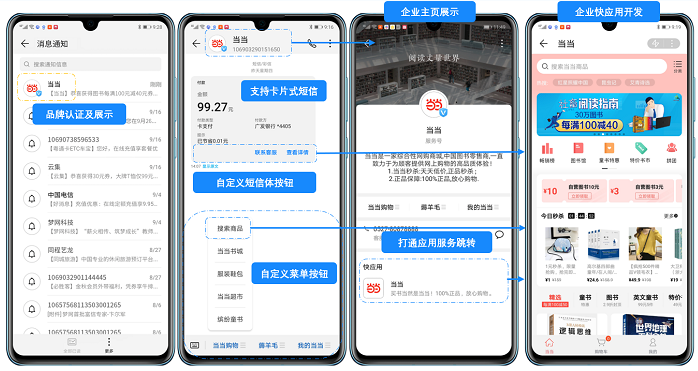 用户接收来自企业的短富信推送时,短信服务号能帮助企业更好实现多媒体化信息触达,企业logo加V露出及品牌信息植入等,提高品牌社会认知度和用户识别度。而信息界面自定义菜单栏和设置链接嵌入,则顺利获得与快应用服务强强联手,实现了用户到H5、小程序、购物主页等界面的直接跳转,一键直达核心营销页面的私域营销闭环打造,让企业在短信服务号这一营销入口就能带来直观的流量转化。