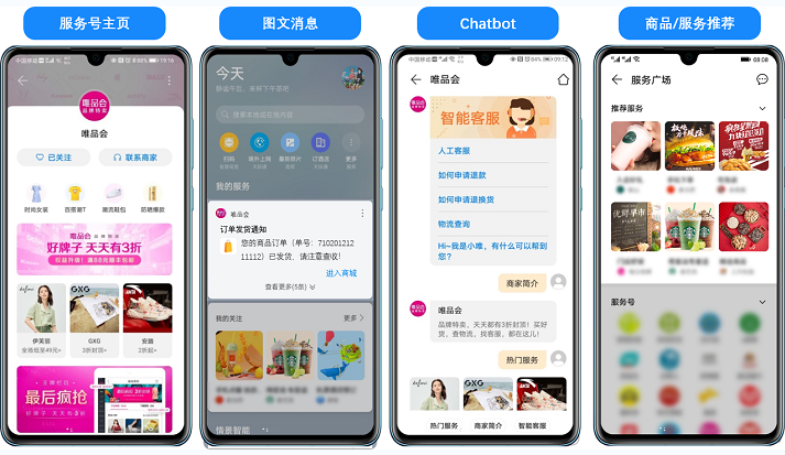 华为服务号顺利获得服务号主页、图文消息、Chatbot及商品服务推荐四项核心功能,打造企业在华为终端的“私域经营阵地”。在服务号主页轻松完成多入口引流关注,服务消息顺利获得负一屏、系统通知栏以卡片式C位展示,用户点击消息按钮直达企业自有阵地,同时多平台信息汇集展示,有效降本。商家可预置高频客服,便捷服务用户,在服务中完成潜在用户转化。当然,华为服务号最大的亮点是企业可以借助华为终端画像,为商家引入华为公域流量(生活服务APP、负一屏及服务广场等),触达新用户。